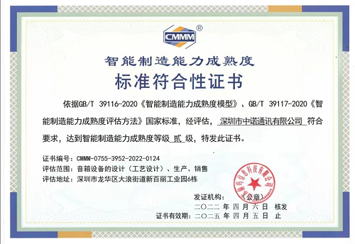 2021年9月-10月,由電子標(biāo)準(zhǔn)院授權(quán)江蘇赫瑪信息科技有限公司組建團(tuán)隊(duì),基于GB/T 39116-2020《智能制造能力成熟度模型》、GB/T 39117-2020《智能制造能力成熟度評(píng)估方法》國(guó)家標(biāo)準(zhǔn),對(duì)中諾通訊新百麗工業(yè)園從工廠設(shè)計(jì)、產(chǎn)品研發(fā)、工藝設(shè)計(jì)、計(jì)劃與調(diào)度、生產(chǎn)作業(yè)、倉(cāng)儲(chǔ)配送、質(zhì)量管控、設(shè)備管理、安全管控、能源管理、環(huán)保管理等20個(gè)能力子域的智能制造能力成熟度,通過(guò)人員交流、現(xiàn)場(chǎng)巡視、系統(tǒng)查看等方法進(jìn)行評(píng)估,認(rèn)定該公司智能制造能力成熟度達(dá)到貳級(jí)水平,得到國(guó)家認(rèn)可。